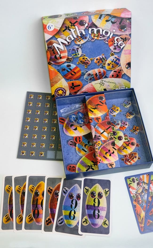 Math’moi ça est un jeu centré sur l’apprentissage des mathématiques, à faire en famille (2 à 6 joueurs) pour s’amuser avec les chiffres et faire découvrir le calcul mental aux plus jeunes. Il s’inspire de la méthode Montessori et son principe est simple : il faut réaliser le meilleur calcul pour atteindre le nombre décidé par les dés, et utiliser cartes et jetons (joliment dessinés par Jean-Noël Duchemin) pour poser ses opérations, en étant le plus rapide.