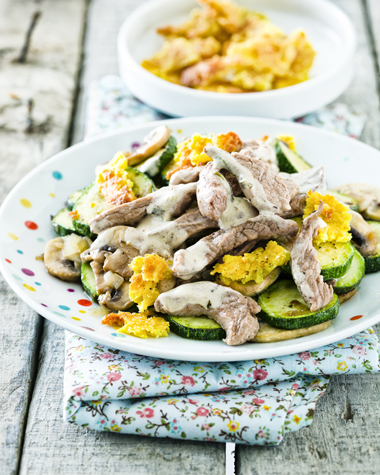 – Servez l’émincé d’agneau sur un lit de légumes, nappez de sauce au basilic et décorez de morceaux de crumble et de copeaux de parmesan.