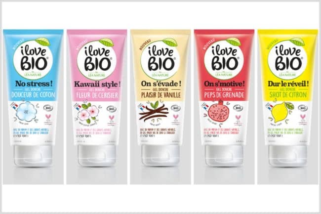 I LOVE BIO est la dernière-née des gammes de gels douche bio Léa Nature. Elle est composée de cinq produits aux parfums fruités : Plaisir de Vanille, Shot de Citron, Peps de Grenade, Douceur de Coton et Fleur de Cerisier.