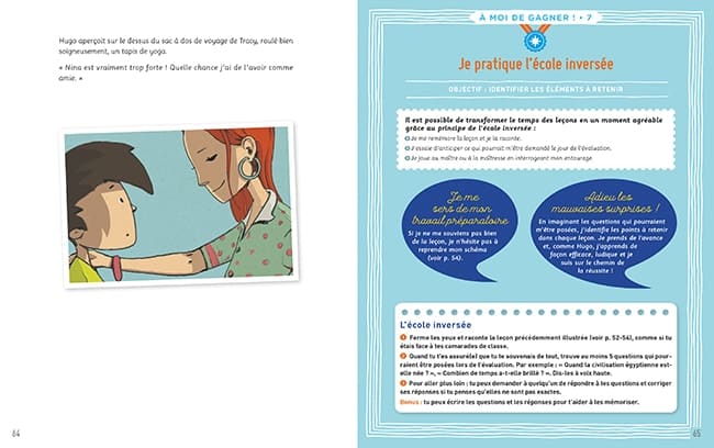 Chaque chapitre de ce conte ludique et bienveillant se conclut par un objectif et une fiche pratique pour aider l’enfant à l’atteindre : J’apprends à gérer mon temps après l’école / Je m’entraîne comme les grands sportifs / Je pratique l’école inversée / Etc. Et une fiche de conseils aux parents. Votre enfant puisera dans Hugo prend son envol des astuces pour l’aider à se concentrer et à bien s’organiser pour ne plus « gaspiller son temps », pour reprendre confiance en lui, et travailler de manière autonome. Les parents y trouveront des clés pour apprendre à lâcher du lest et à faire confiance. Parce qu’il n’y a pas que l’école dans la vie, et que pour travailler efficacement, il est important de laisser la place aux activités créatives, qui vont stimuler la mémoire, ou sportives, pour retrouver un esprit positif.
