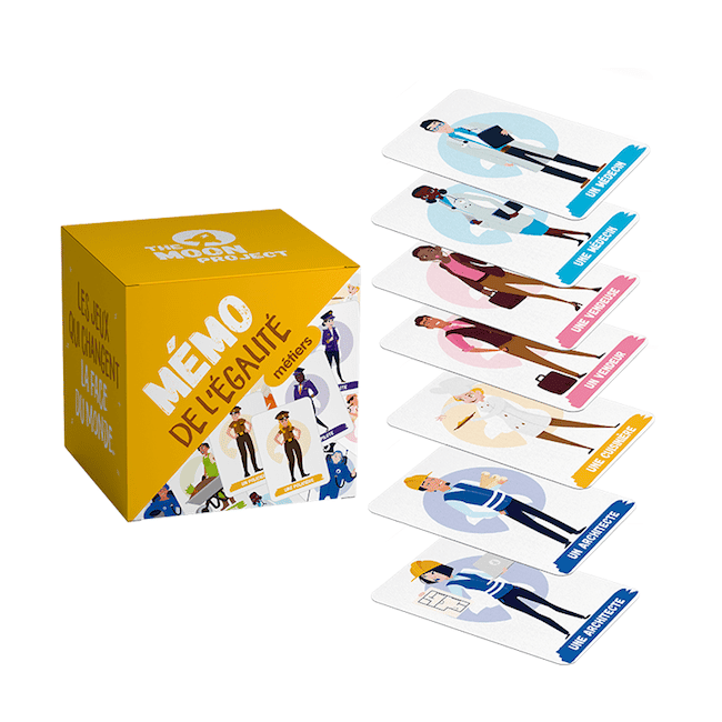 Le premier, Le Mémo de l’égalité, est un jeu de cartes pour permettre aux enfants d’associer un métier autant à une femme qu’à un homme : un policier, une policière, un danseur, une danseuse, un docteur, une docteure… Vous devrez assembler une série de 24 paires. C’est à celui qui repère le plus de paires que revient l’affaire ! Une édition spéciale métiers pour se familiariser avec l’égalité.