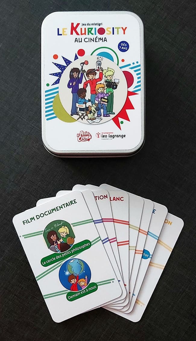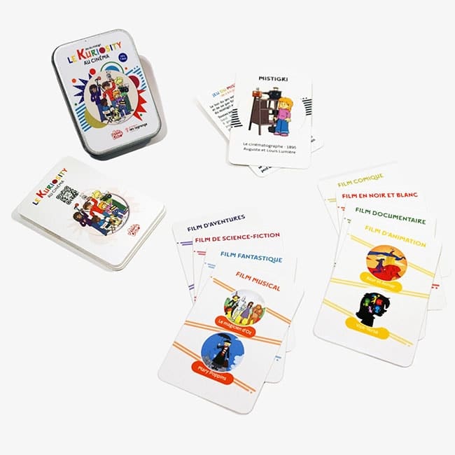Le Kuriosity au cinéma est un jeu du mistigri. Les enfants partent à la découverte du 7e art. En famille ou avec leurs copains, ils découvriront des films de toutes les époques, de 1928 à 2020 et de différents genres cinématographiques : en noir blanc, fantastique, comique, documentaire, musical, d’animation, d’aventures et de science-fiction. Vous pourrez visualiser les bandes annonces ou extraits de films grâce à un QR code se trouvant au dos de chaque carte. Un jeu pour partager son amour et ses connaissances du 7e art avec ses enfants.