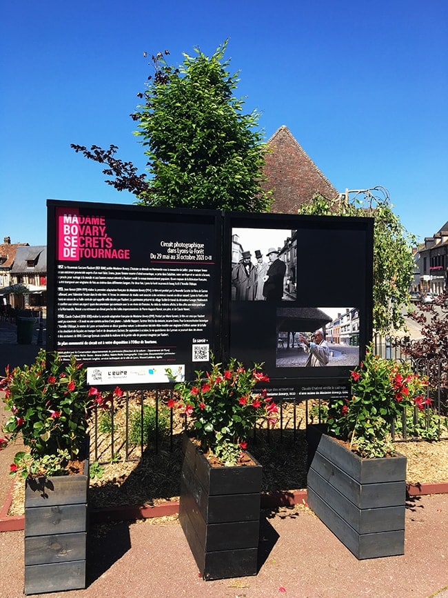 Une exposition en plein air de photos de ces deux tournages permet de se balader dans le village sur les traces des films. Lyons a été retenu pour figurer Yonville du roman car le village est parfaitement préservé. Il suffit d'installer quelques décors en plus pour que l'illusion soit parfaite. Chabrol et son équipe y ont carrément passé deux mois de tournage ! 300 figurants étaient mobilisés, 600 m2 de décor appliqués sur les façades des magasins et de la terre battue répandue sur le sol partout en ville... On apprend une foultitude d’anecdotes lorsque l'on suit les visites guidées qui sont proposées par l'office de tourisme de Lyons-la-Forêt (réservation à l'avance nécessaire). Mais rien qu’en suivant le parcours et en allant de panneau en panneau, la balade sur les pas de ces deux tournages est instructif et passionnant.