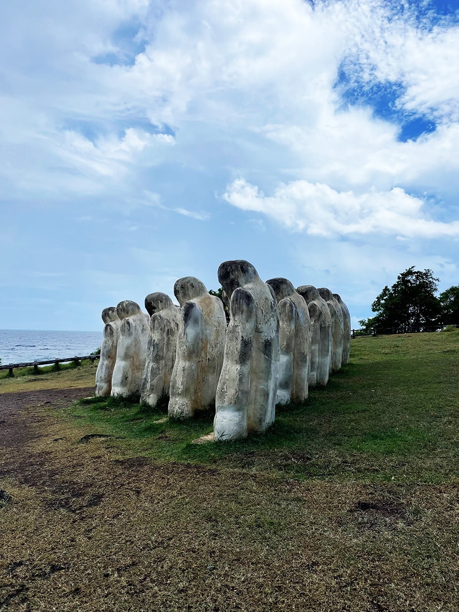 L’autre création de Laurent Valère n’est pas moins massive, mais elle est plus facile d’accès, puisqu’elle est disposée au bord d’une route, sur une corniche face à l’océan et la pointe du Diamant, cet étonnant rocher-île qui émerge au milieu des flots. Elle représente des géants de pierre qui commémorent le naufrage d’un navire négrier en 1830. Un monument très émouvant…