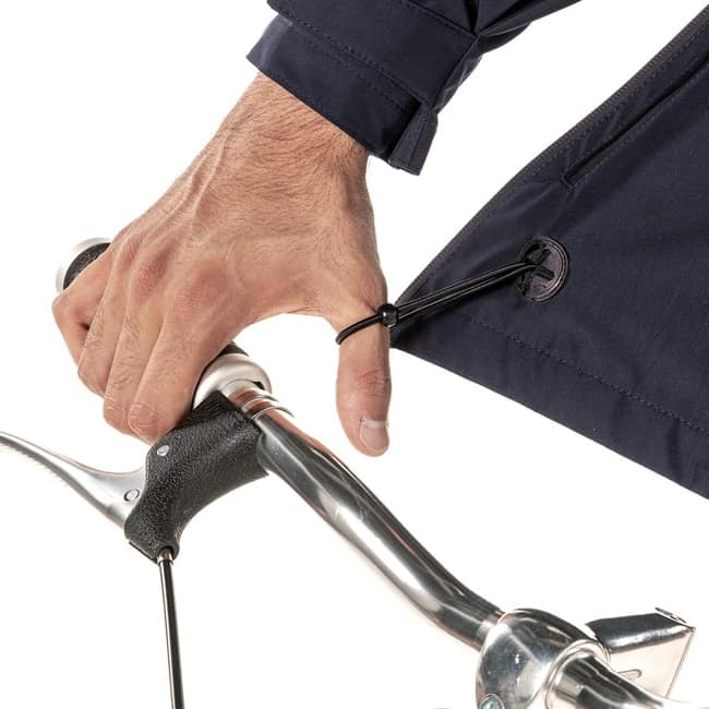 Quand on ouvre ces soufflets en actionnant une simple fermeture « éclair », on dispose d’un surcroît de tissu que l’on peut tendre en l’accrochant sur le guidon ou simplement à ses pouces. De ce fait, votre chéri à vélo peut bénéficier d’un couvre-jambes bien malin. C’est vraiment bien vu et pour avoir testé la veste pluie vélo Magic Day, ça fonctionne vraiment ! Bon, par gros temps avec une pluie abondante, la « cape » ne pourra pas arrêter toute l’eau soufflée en bourrasque. Mais, déjà, elle évite le plus gros de venir mouiller votre cycliste. Et par temps pluvieux « normal », son efficacité est vraiment probante. En tout cas, on sent vraiment la différence avec une veste vélo classique qui ne protège pas du tout le bas du corps…