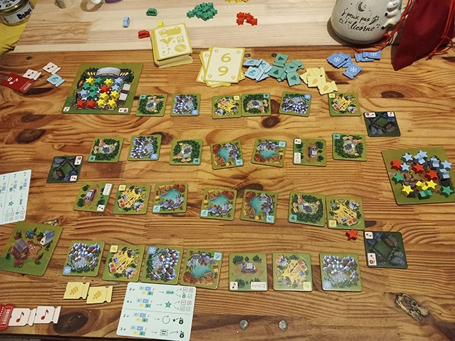 Une autre chose que j’apprécie bien, ce sont les matériaux : les tuiles en carton colorées et les pièces en bois, c’est très agréable pour jouer.