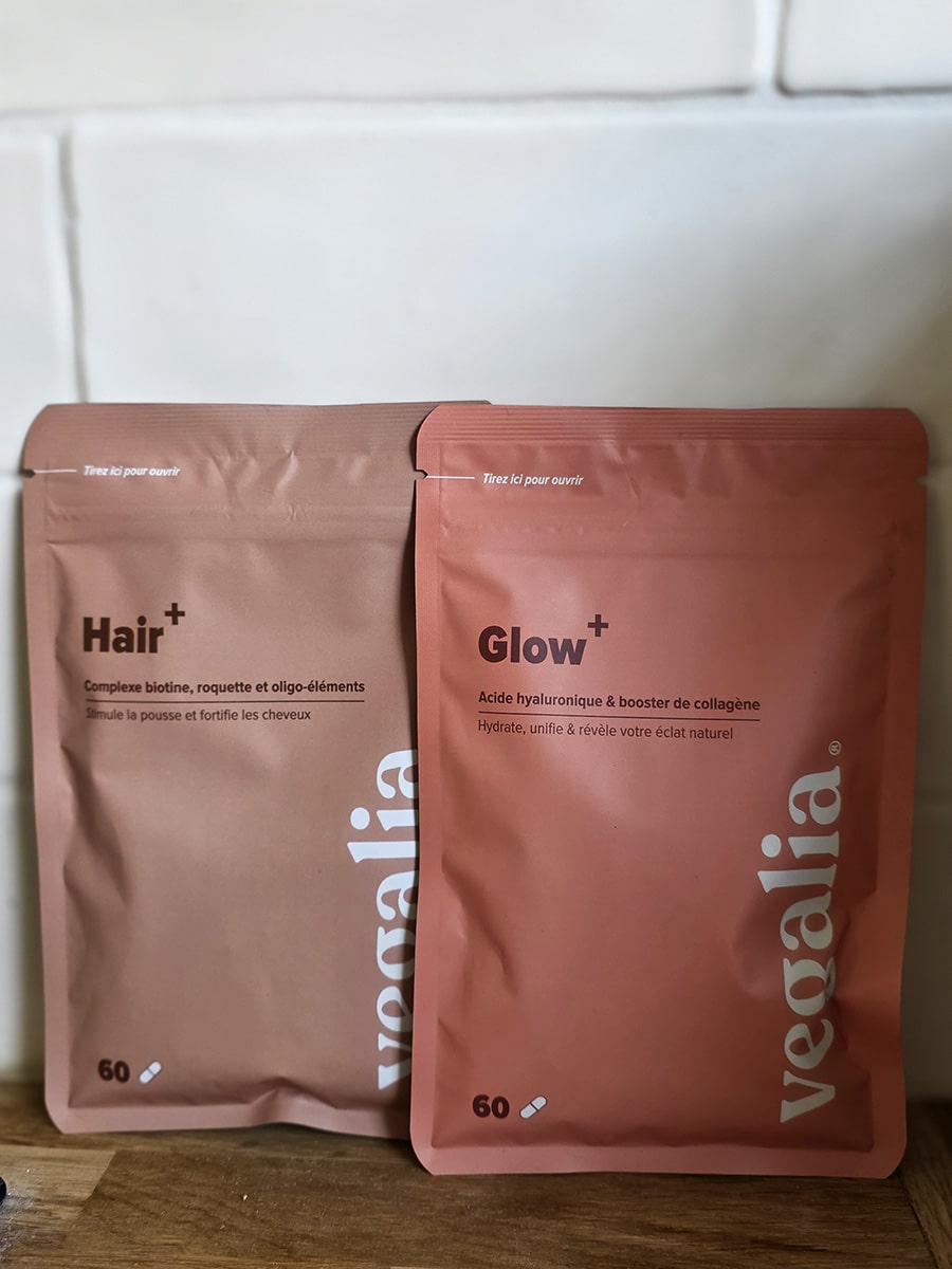 Il est recommandé de suivre la cure spéciale cheveux de Vegalia sur trois mois — le temps d’agir sur un cycle capillaire complet. Hair+ peut se prendre toute l’année ou en cure saisonnière, au printemps et à l’automne. Le packaging est sobre, élégant, clairement pensé pour faire sérieux plutôt que commercial. Seul bémol pratique : les sachets ne tiennent pas debout seuls sur une étagère, contrairement à un flacon classique.