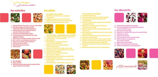 Plus de 50 recettes, parmi lesquelles : les « Asperges blanches des Landes, sauce aux oeufs mollets », la « Tarte Tatin aux échalotes nouvelles, miel et romarin », le « Risotto aux asperges vertes cuites et crues », les « Langoustines rôties dans leur carapace au beurre salé », la « Dorade grise rôtie au plat et févettes au citron confit », les « Tomates farcies de ma grand-mère Charlotte », les « Feuilletés de saucisse de Toulouse à la moutarde et au cumin », la « Tarte au fromage blanc, compotée de rhubarbe et fraises à la fleur de sureau », « l’Omelette à la confiture de cerises et à la menthe fraîche », le « Gâteau tout chocolat aux fraises Gariguettes », et bien d’autres…