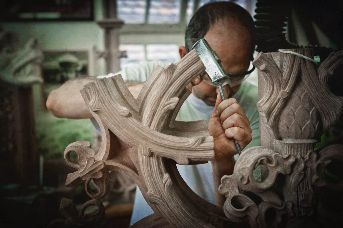Cette maison de l’Oeuvre Notre-Dame est unique en France : c’est le seul atelier qui se dédie uniquement à entretenir un édifice religieux, depuis sa création, au XIIIème siècle. Ici, les tailleurs de pierre taillent encore à la main le grès de la cathédrale, avec les mêmes techniques que lors des débuts de sa construction (étalée sur quatre siècles!)… il y a 800 ans !
