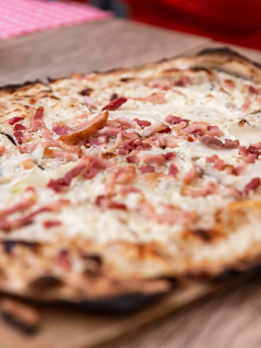 Si votre faim, ou votre porte-monnaie, ne sont pas à la hauteur du fameux Kammerzel, contentez-vous d’une belle tarte flambée sur les quais ! Non moins célèbre que la choucroute (et plus légère) la tarte flambée est aux Alsaciens ce que la pizza est aux Italiens, et il est impossible de quitter la ville sans aller en déguster une, ou plutôt plusieurs… Car la tarte flambée, en Alsace, ça se commande à la chaîne, en plusieurs exemplaires, et ce n’est pas chacun la sienne… on partage, au fur et à mesure qu’elles arrivent, et c’est très convivial, en plus d’être bon !