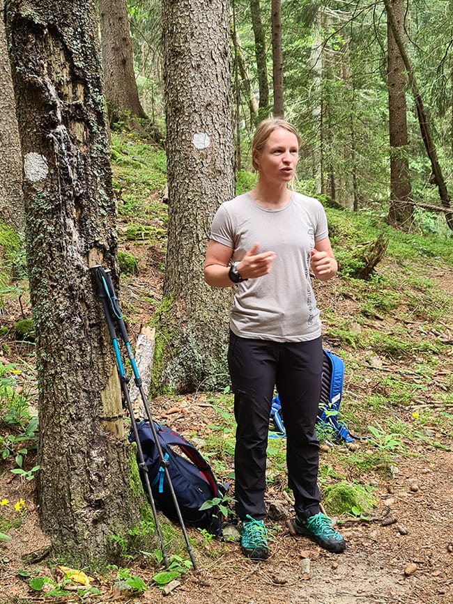 Karine, guide accompagnatrice en moyenne montagne, propose des randonnées en famille pour découvrir la faune et la flore (juillet est le mois le plus fleuri). Une balade instructive ponctuée d’infos insolites ou rigolotes et de petites expériences qui raviront petits et grands. Karine vous parlera par exemple sexualité de l’épicéa… Vous apprendrez que le sapin est un arbre de plaine, et que les résineux qui vous entourent sont des épicéas… Que le mélèze est le seul conifère à perdre ses aiguilles… Que les fourmilières sont un signe de bonne santé pour la forêt… Qu’on utilise le lichen appelé « barbe de sorcière » dans la fabrication de parfums à Grasse… Qu’il y avait tellement d’ours à une époque dans ces montagnes qu’on payait la dîme avec des pattes d’ours…