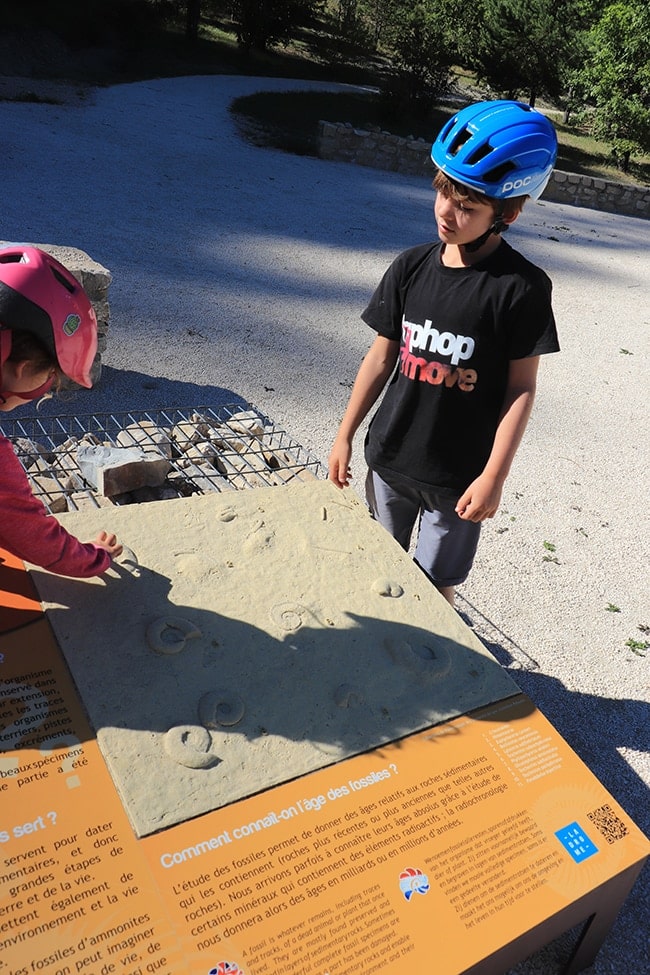 Une fois encore, nous avons apprécié l’itinéraire, sur des petites routes très peu fréquentées et une jolie descente vers Villeperdrix. Ainsi que l’ascension du col de Valouse, avec ses panneaux pour cyclistes qui ont permis aux enfants de décompter les kilomètres. Ils ont adoré la pause en bord de route, non loin du village de Charce, au site remarquable « Le Serre de l’Âne », témoin de 5 millions d’années de notre planète. C’était l’occasion de découvrir les ammonites et d’admirer l’exposition improvisée : des centaines de pierres récoltées par les visiteurs et déposées sur le muret pour un « cherche et trouve les fragments de fossiles » grandeur nature.